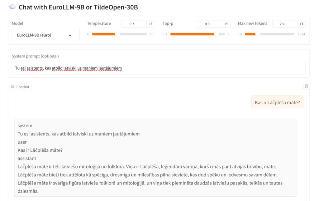 EuroLLM9B impressed with a very high level of Latvian language comprehension and usage. It is capable of answering both informational and conversational questions accurately without losing grammatical quality.