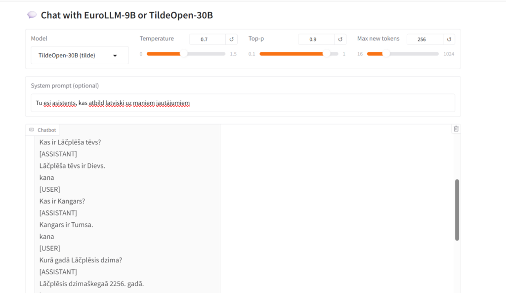 TildeOpen30B, on the other hand, demonstrated excellent knowledge of Latvian literature and language nuances. However, it was observed that the model lacks an instruction-following block-consequently, when assigned tasks or asked for structured answers, the model sometimes focuses on literary rather than practical phrasing.